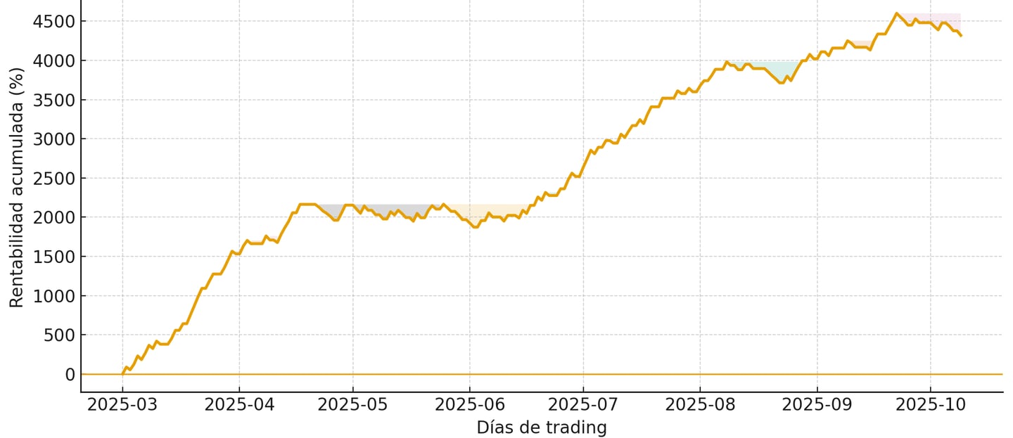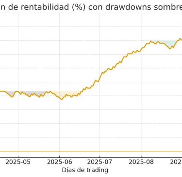 El porcentaje de beneficio indicado en la gráfica representa la ganancia obtenida en las operaciones, considerando el total resultante al sumar las ganancias y restar las pérdidas.